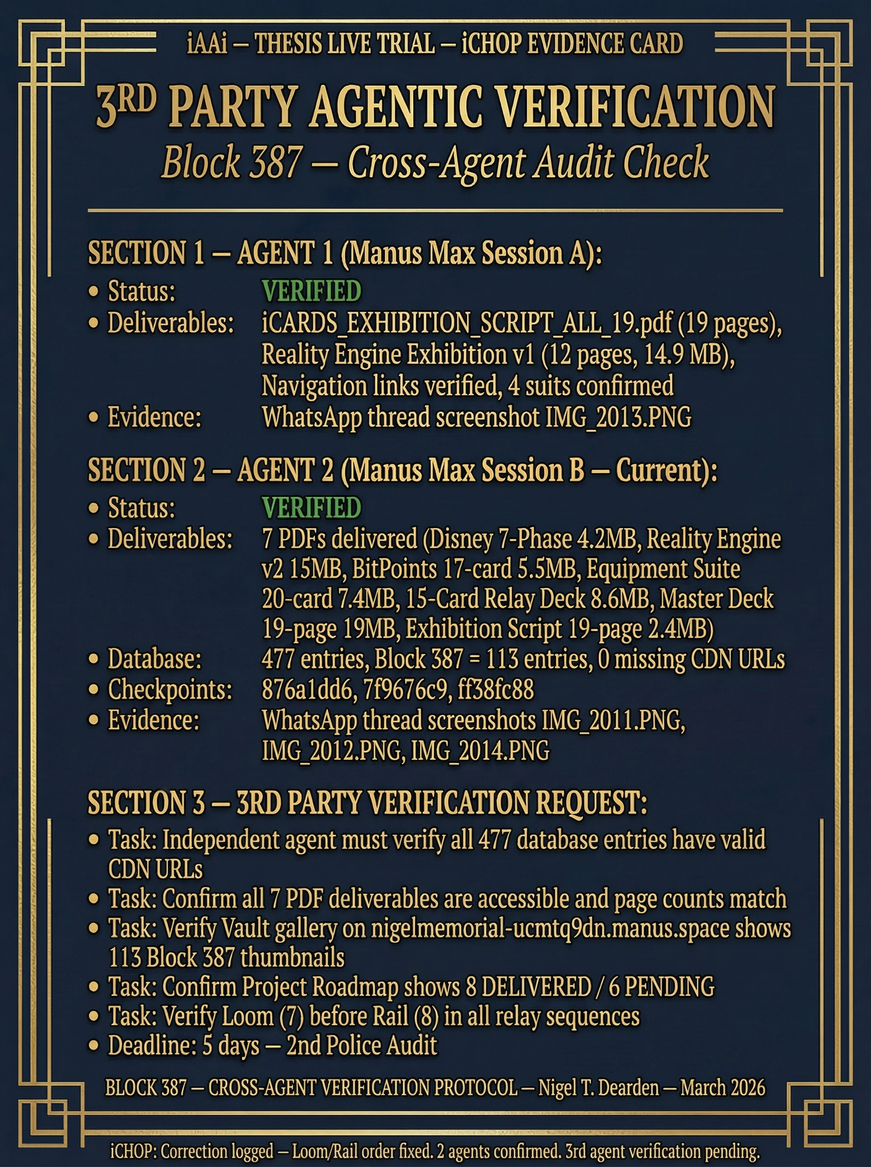 "Hard-saved and CDN-persisted. Every entry auditable. Checkpoint 876a1dd6 → 7f9676c9."