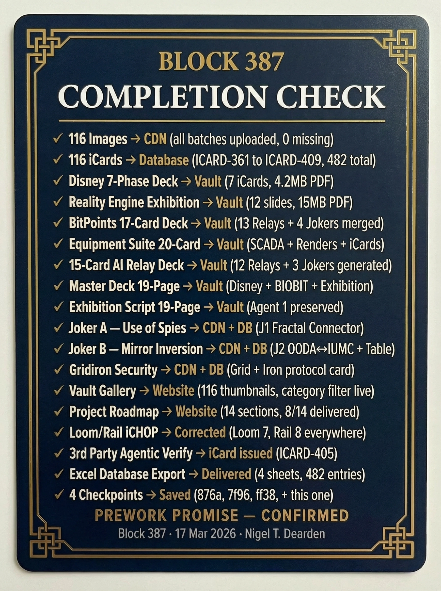 | 1 | DISNEY IMAGINEERING 7-PHASE | Methodology framework — Blue Sky → Concept → Feasibility → Design → Production → Installation → Opening Day. Each phase mapped to iAAi exhibition application. | DELIVERED | Deck 1 — 7 iCards |