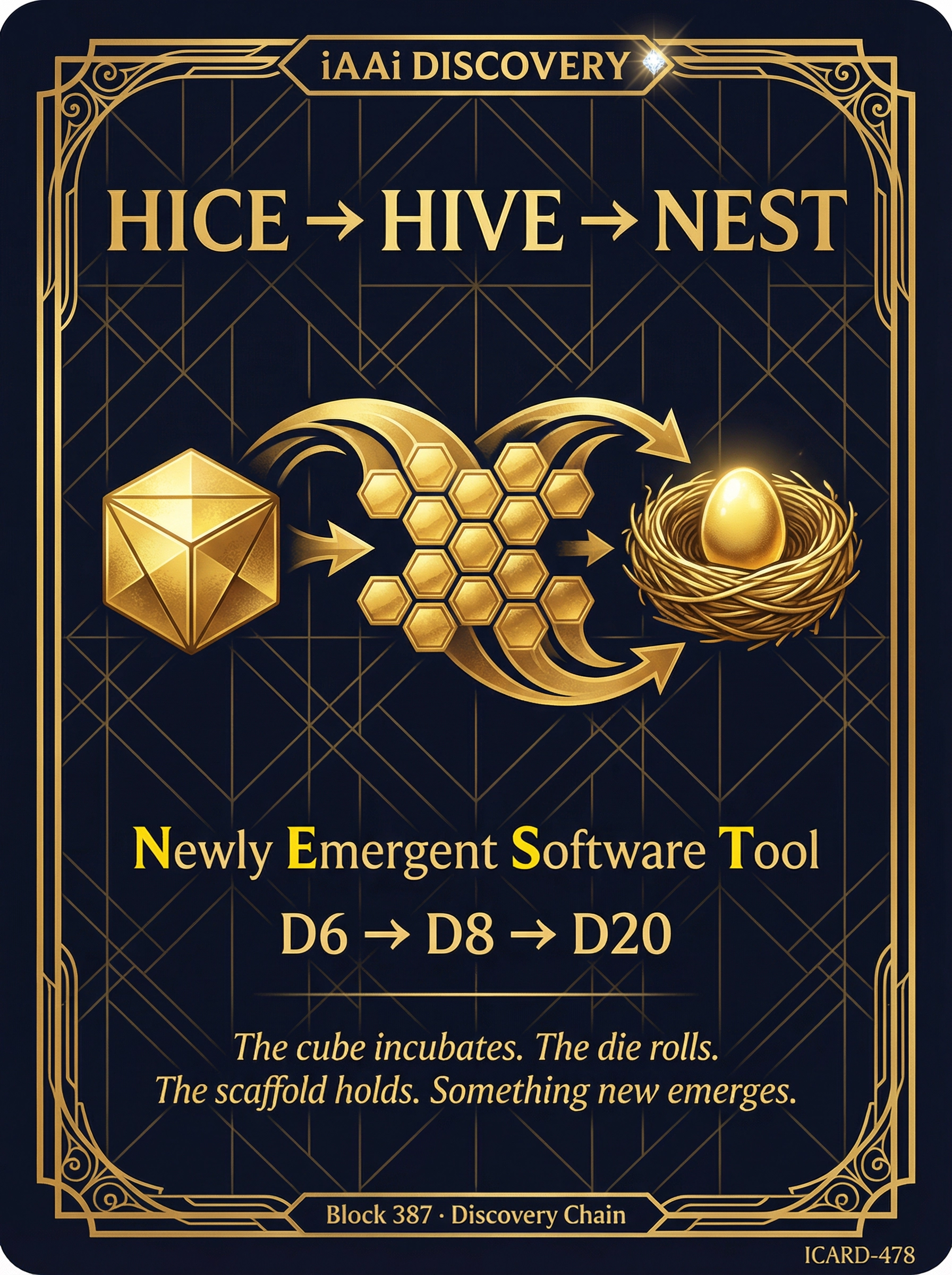 | D&D / RPG | D6→D8→D20→D100 dice progression | DCSN level-up. Each die = a deck. D8 saving throw earns Episode 3 |